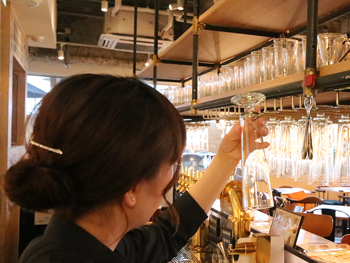 「ビールを入れるグラスは、手洗いをした上で逆さまにして干し、自然乾燥させています。グラスを布で拭くと糸くずとかがついてしまうことがあるのですが、そうしたものもビールの味に影響してしまうからです。とにかく、いかにビールをベストの状態でお客様にお届けできるかを意識していますね」