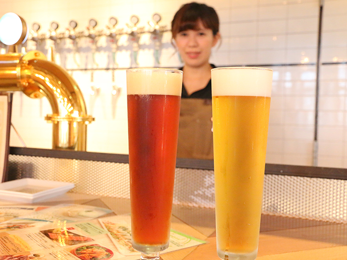 実際に2種類のビールを入れていただきました。確かに、色合いが全然違いますね。
